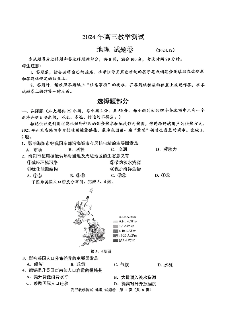 浙江省嘉兴市2024年12月高三教学测试 地理