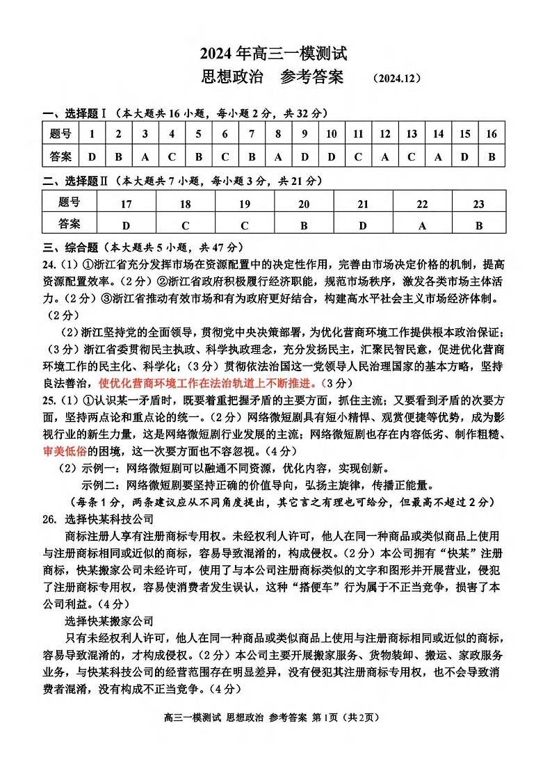 浙江省嘉兴市2024年12月高三教学测试 政治答案