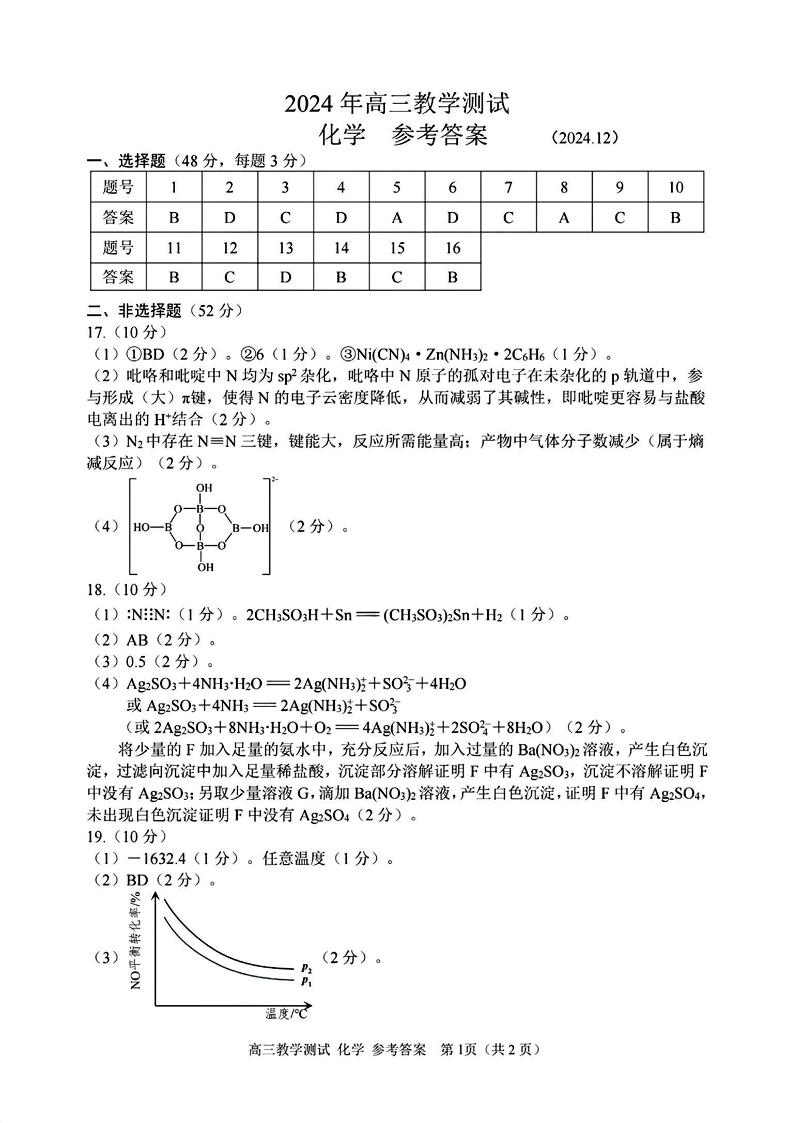 浙江省嘉兴市2024年12月高三教学测试 化学答案