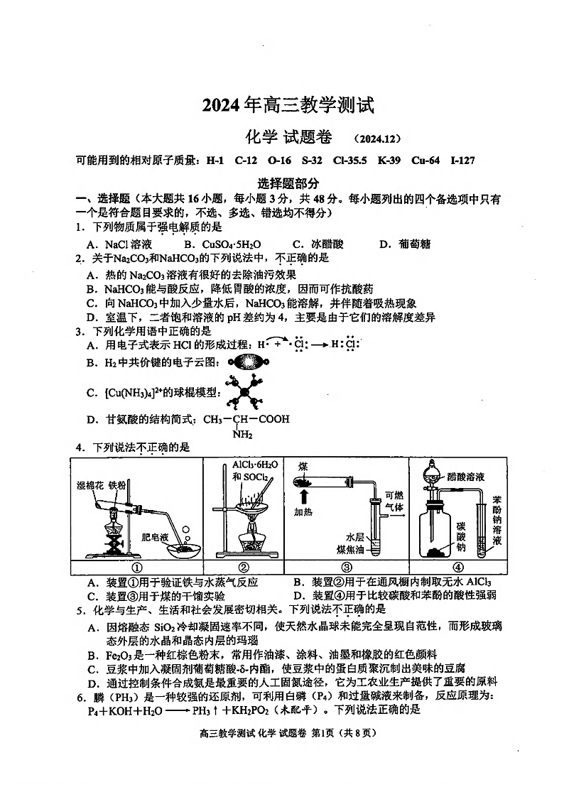 浙江省嘉兴市2024年12月高三教学测试 化学