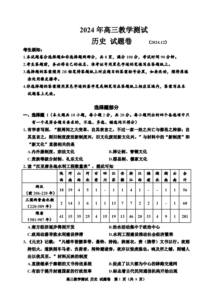 浙江省嘉兴市2024年12月高三教学测试 历史