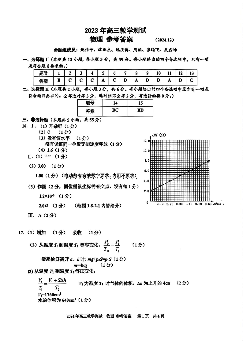 浙江省嘉兴市2024年12月高三教学测试 物理答案