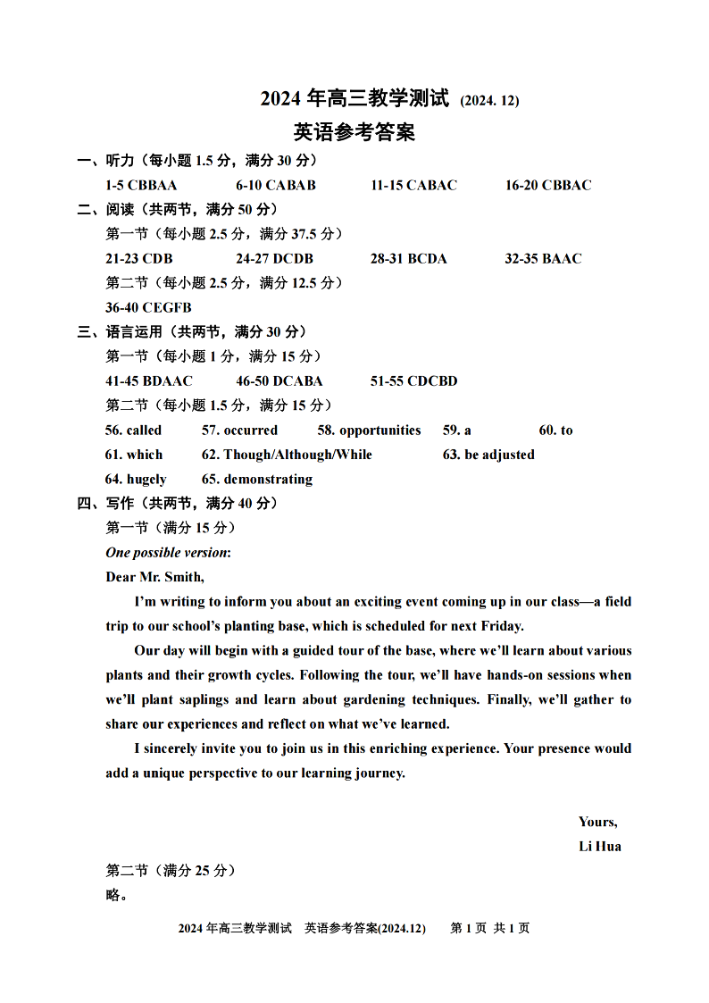 浙江省嘉兴市2024年12月高三教学测试 英语答案