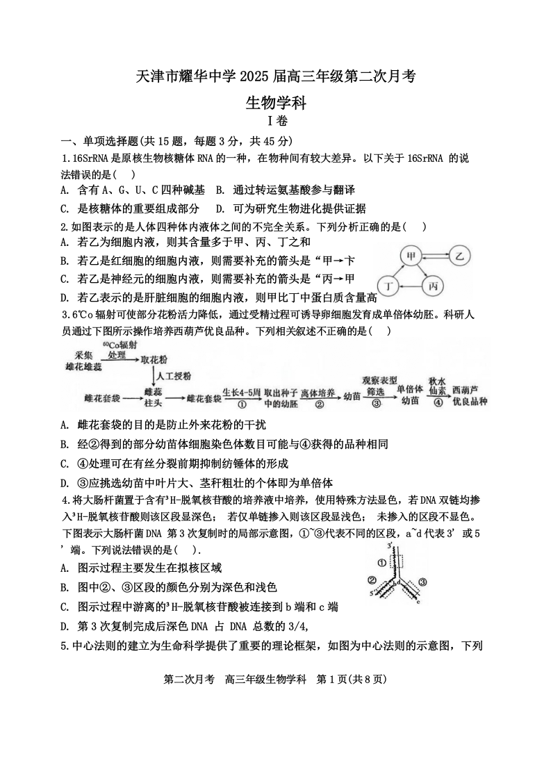 天津市耀华中学2025届高三上学期第二次月考 生物