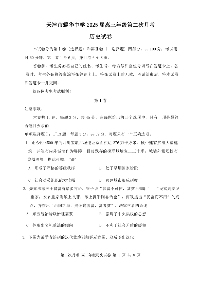 天津市耀华中学2025届高三上学期第二次月考 历史