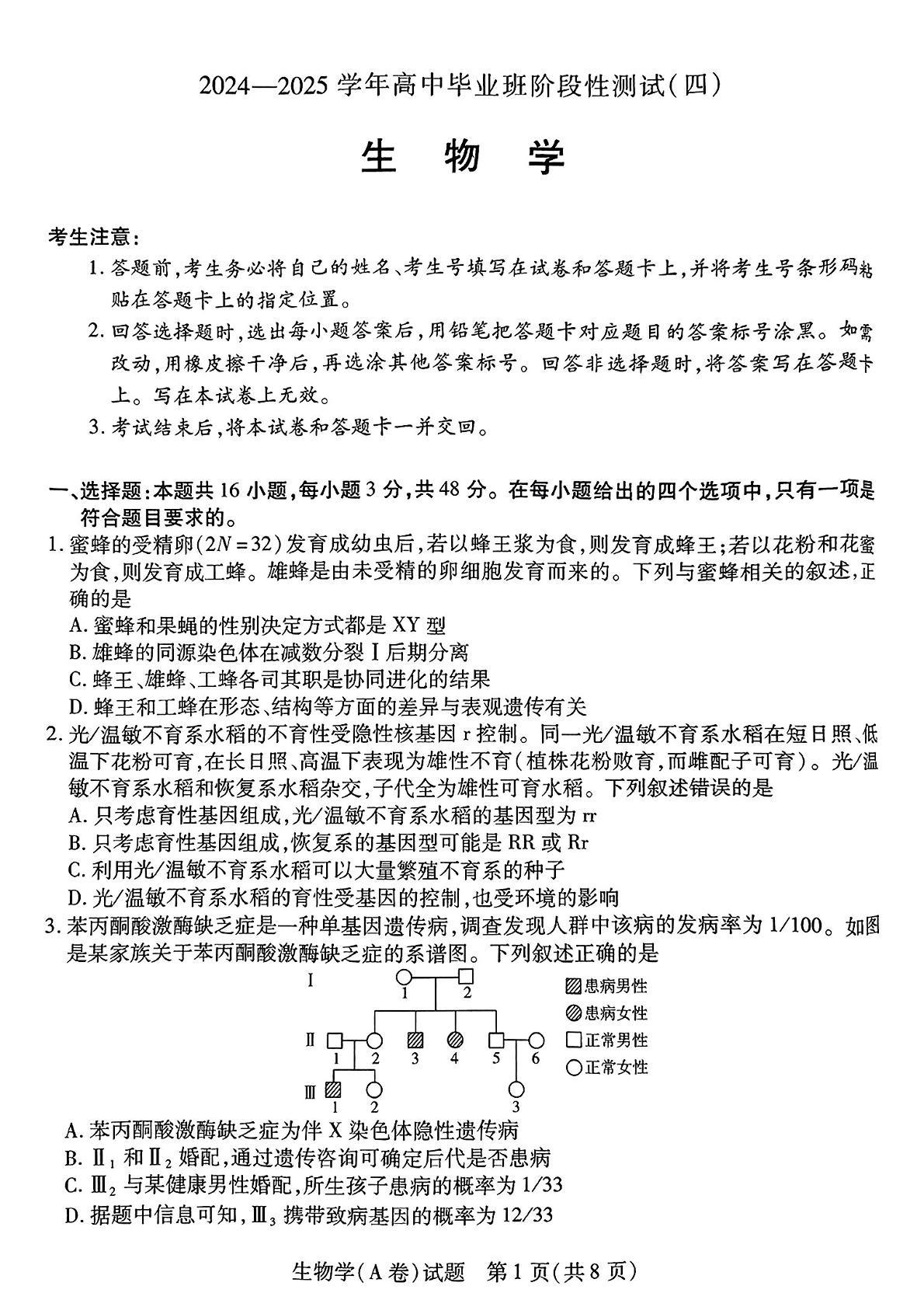 河南省天一大联考2025届高中毕业班阶段性测试(四)生物