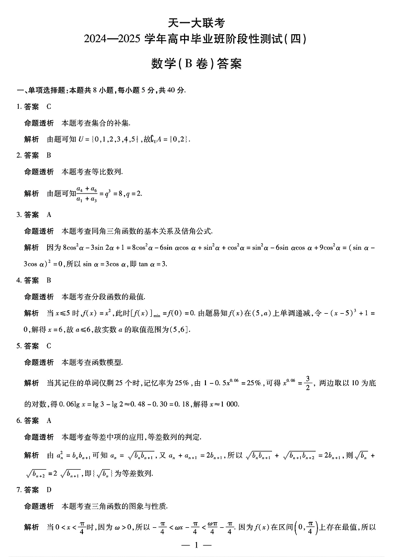 河南省天一大联考2025届高中毕业班阶段性测试(四)数学答案