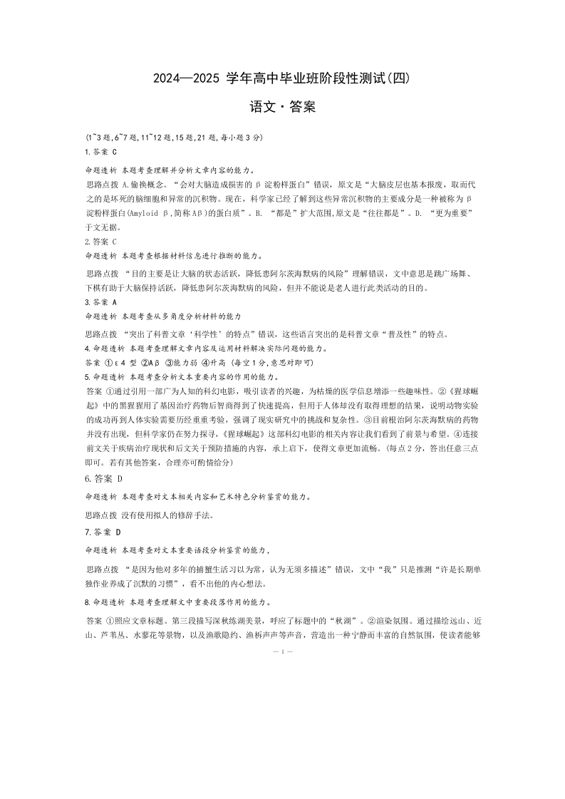 河南省天一大联考2025届高中毕业班阶段性测试(四)语文答案