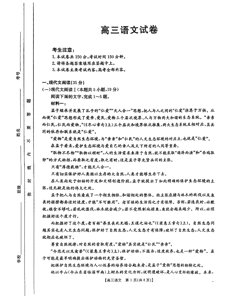 青海省部分学校2025届高三12月大联考 语文