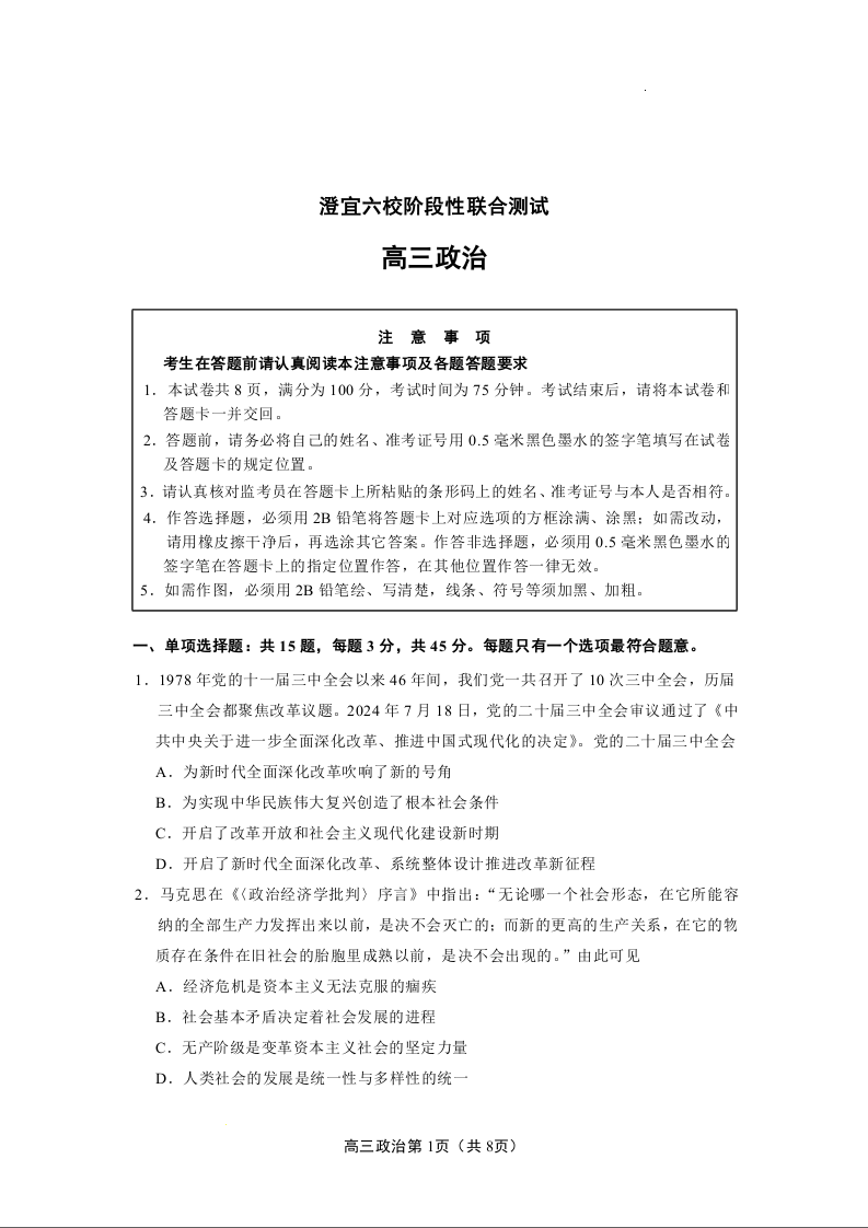 江苏省无锡市澄宜六校2025届高三上学期12月联考 政治