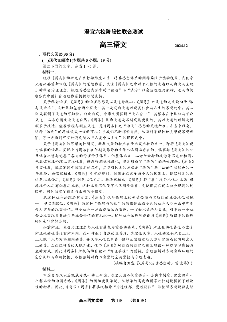 江苏省无锡市澄宜六校2025届高三上学期12月联考 语文