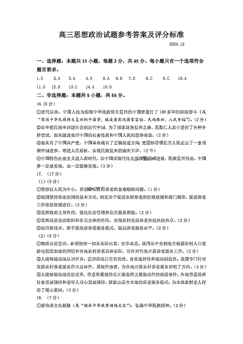山东省名校考试联盟2024年12月高三阶段性检测 政治答案