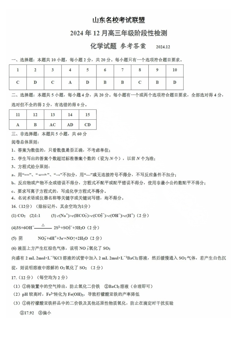 山东省名校考试联盟2024年12月高三阶段性检测 化学答案