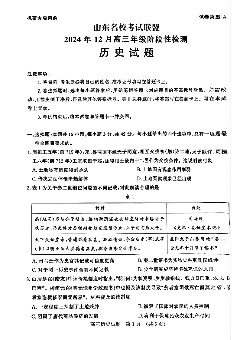 山东省名校考试联盟2024年12月高三阶段性检测 历史