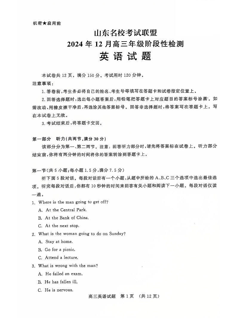 山东省名校考试联盟2024年12月高三阶段性检测 英语