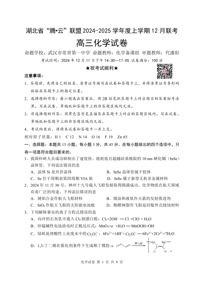 湖北省“腾•云”联盟2024-2025学年度上学期12月联考 化学