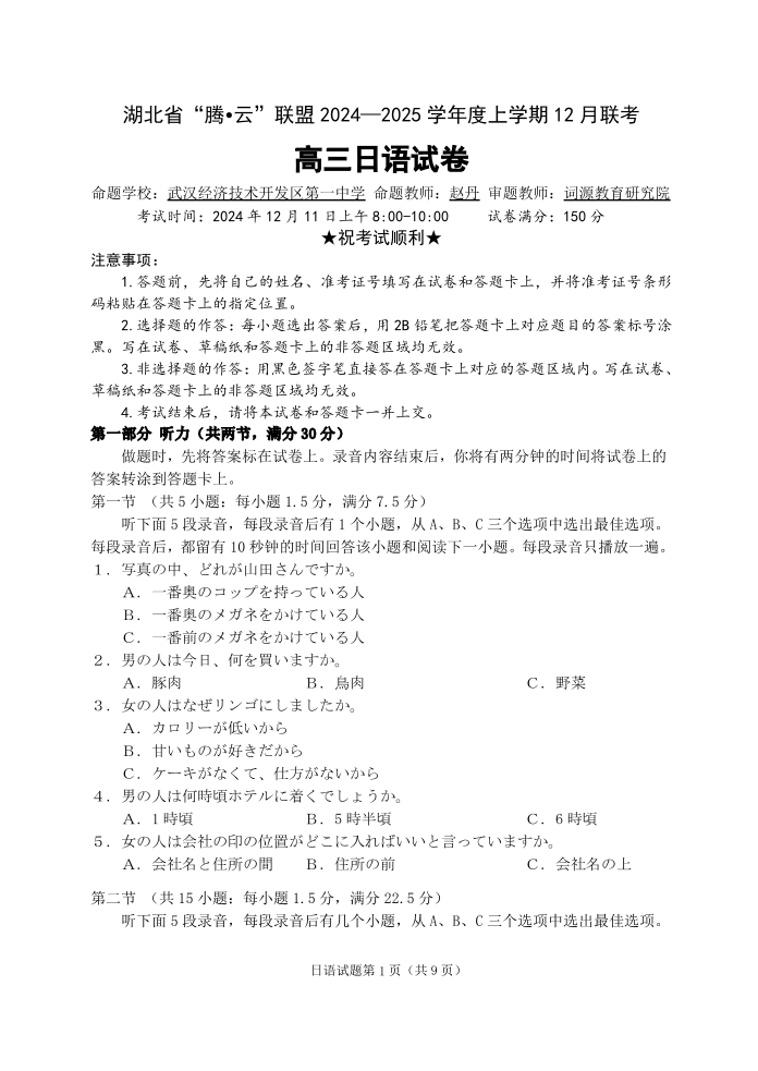 湖北省“腾•云”联盟2024-2025学年度上学期12月联考 日语