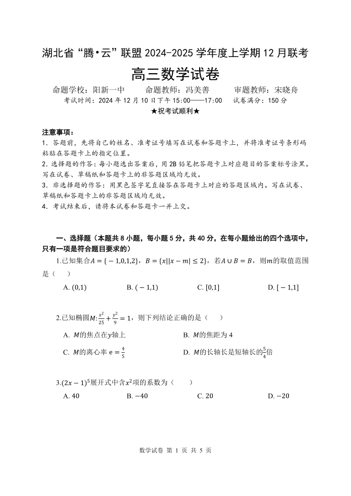 湖北省“腾•云”联盟2024-2025学年度上学期12月联考 数学