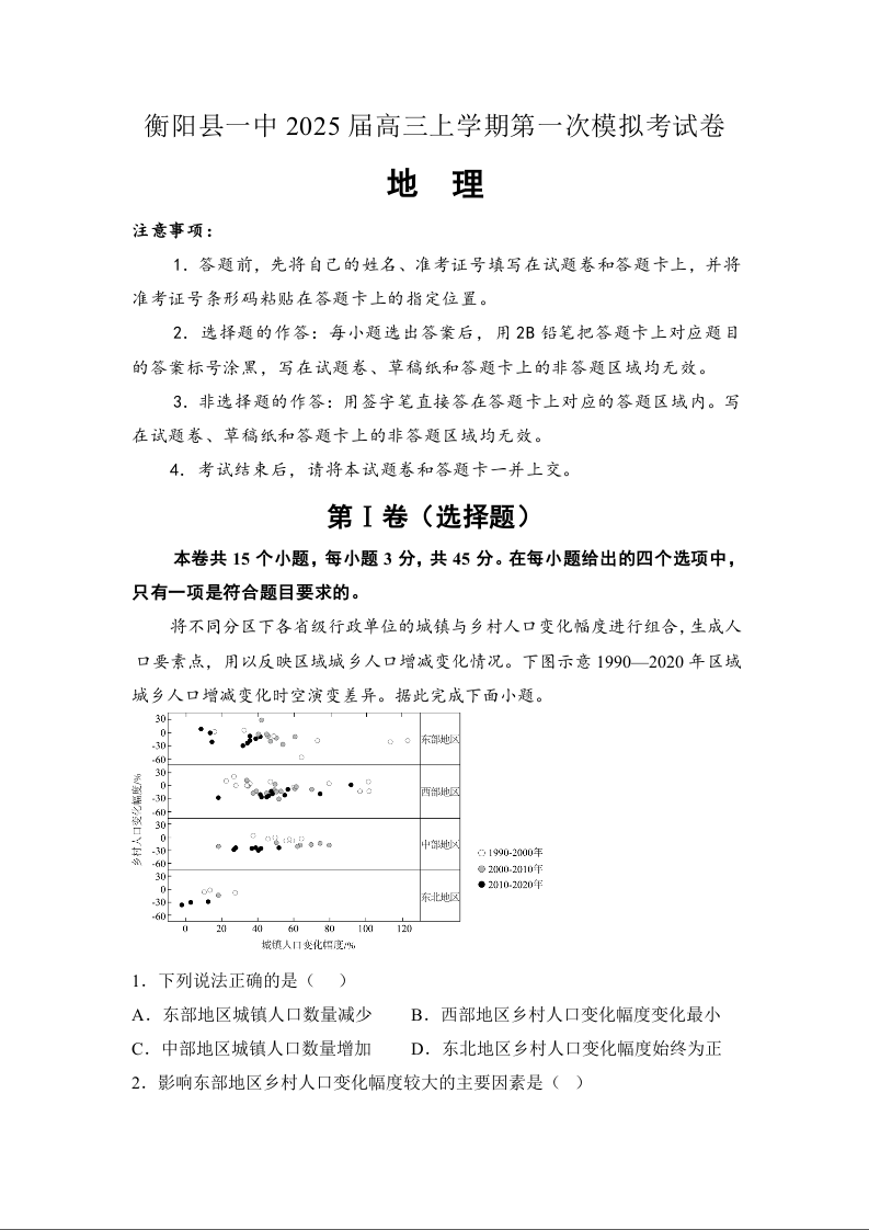 衡阳县一中2025届高三上学期第一次模拟考试 地理