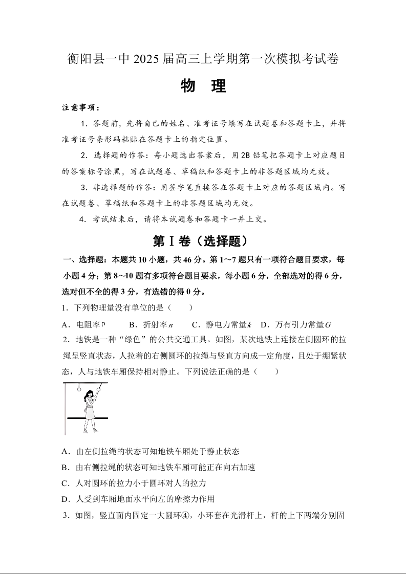 衡阳县一中2025届高三上学期第一次模拟考试 物理