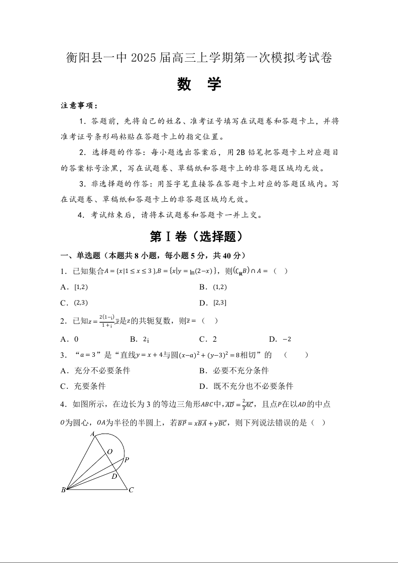 衡阳县一中2025届高三上学期第一次模拟考试 数学