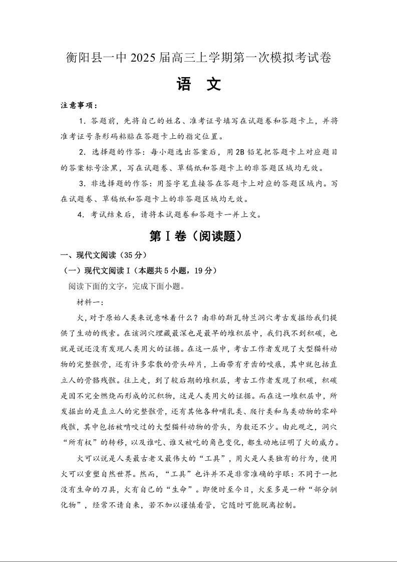 衡阳县一中2025届高三上学期第一次模拟考试 语文