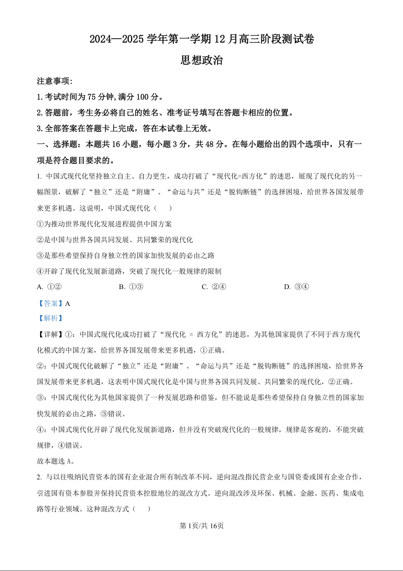 河北省NT教育2025届高三上学期12月阶段性测 政治答案