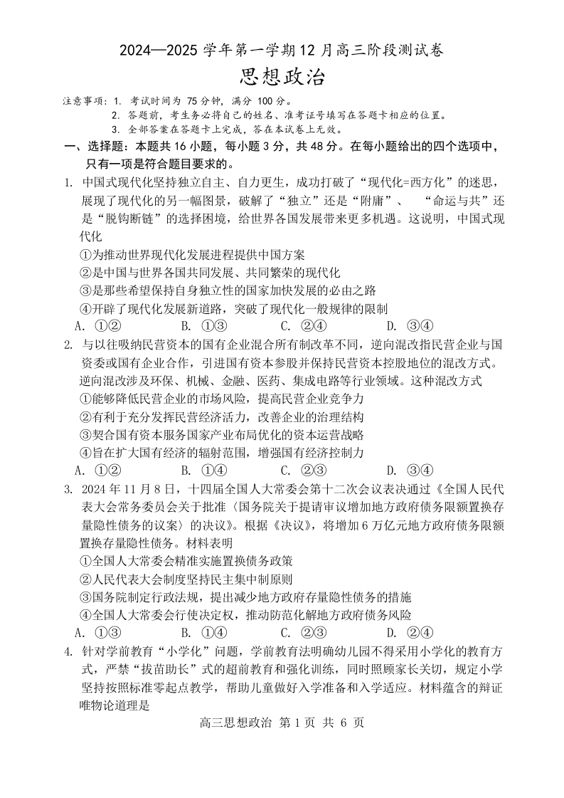 河北省NT教育2025届高三上学期12月阶段性测 政治
