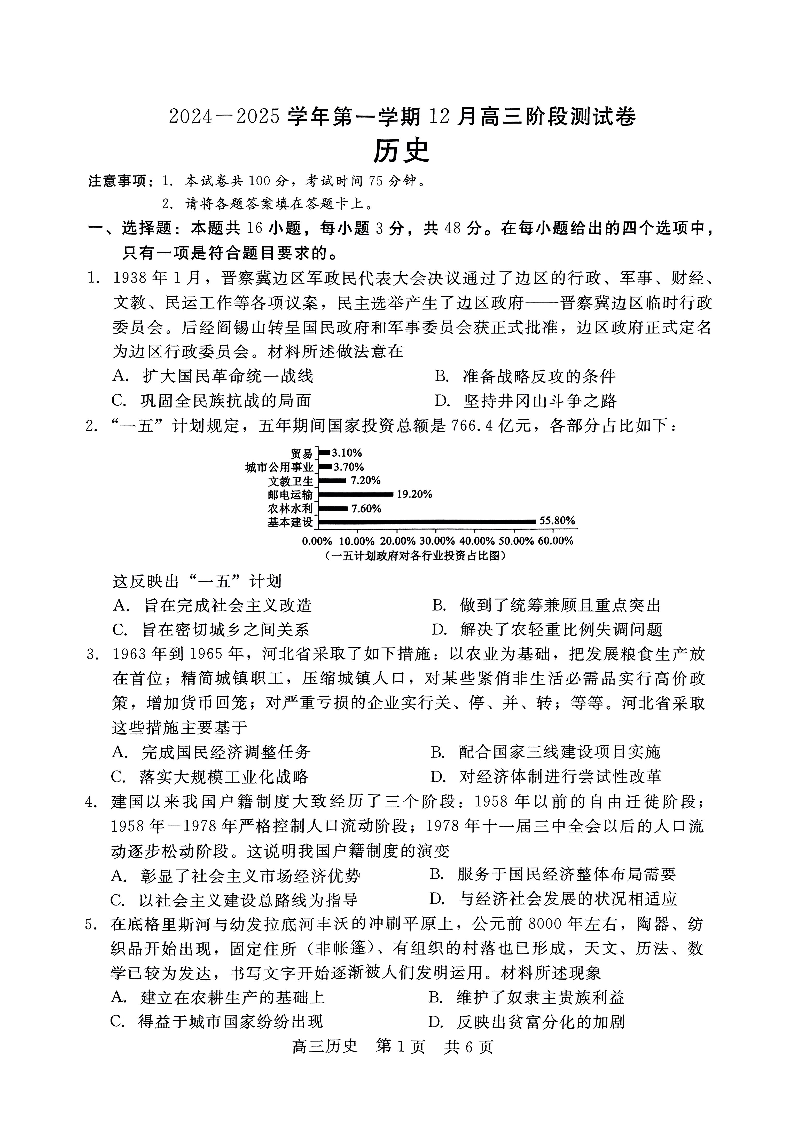 河北省NT教育2025届高三上学期12月阶段性测 历史