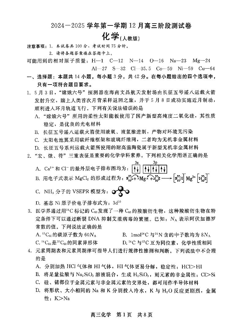 河北省NT教育2025届高三上学期12月阶段性测 化学