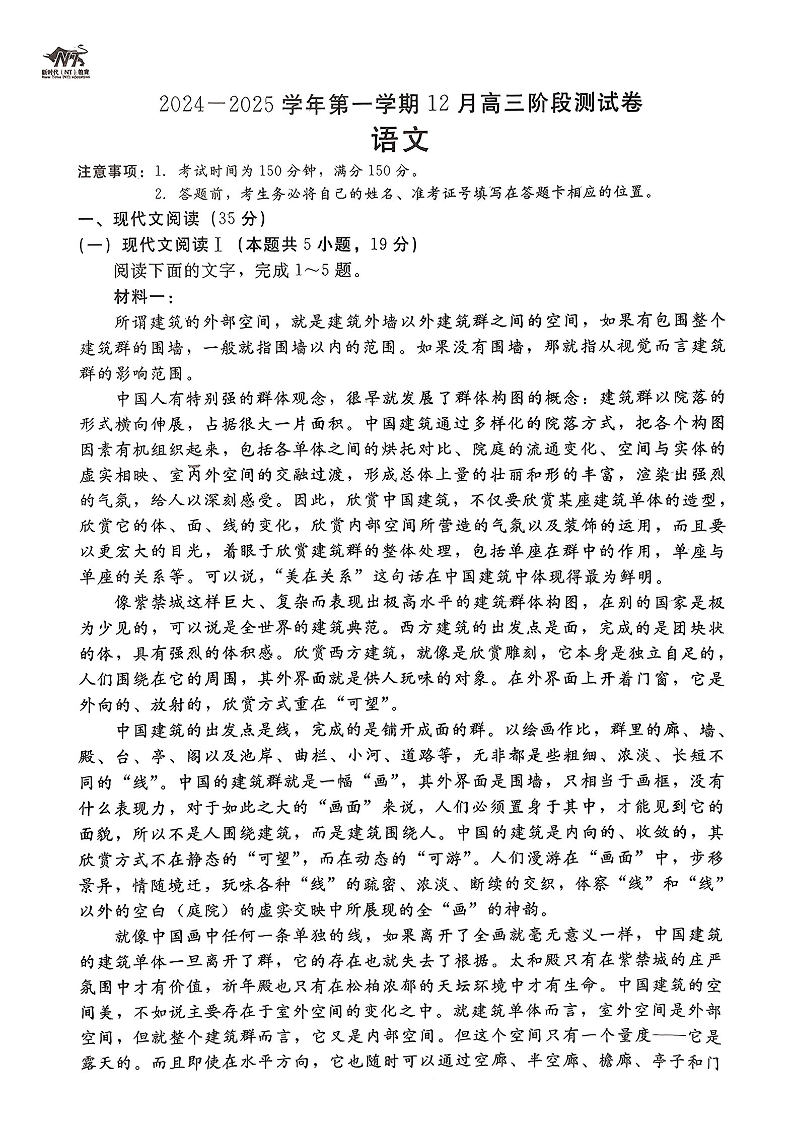 河北省NT教育2025届高三上学期12月阶段性测 语文