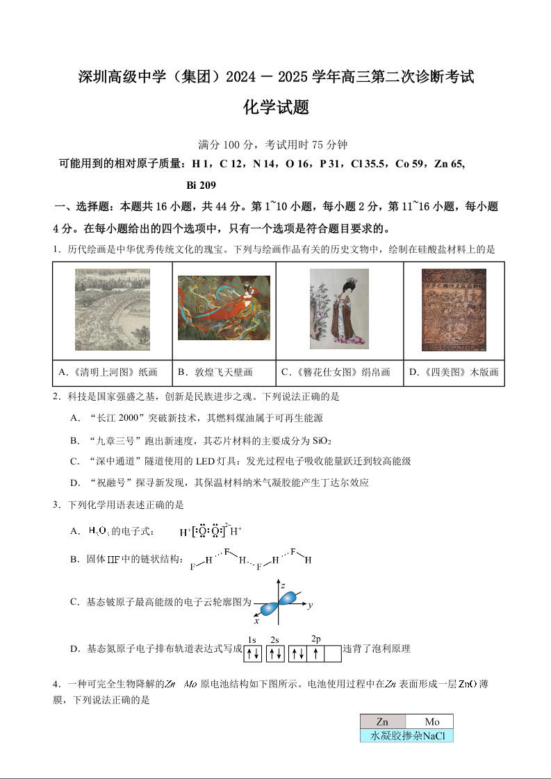 深圳高级中学(集团)2024-2025学年高三第二次诊断考试 化学