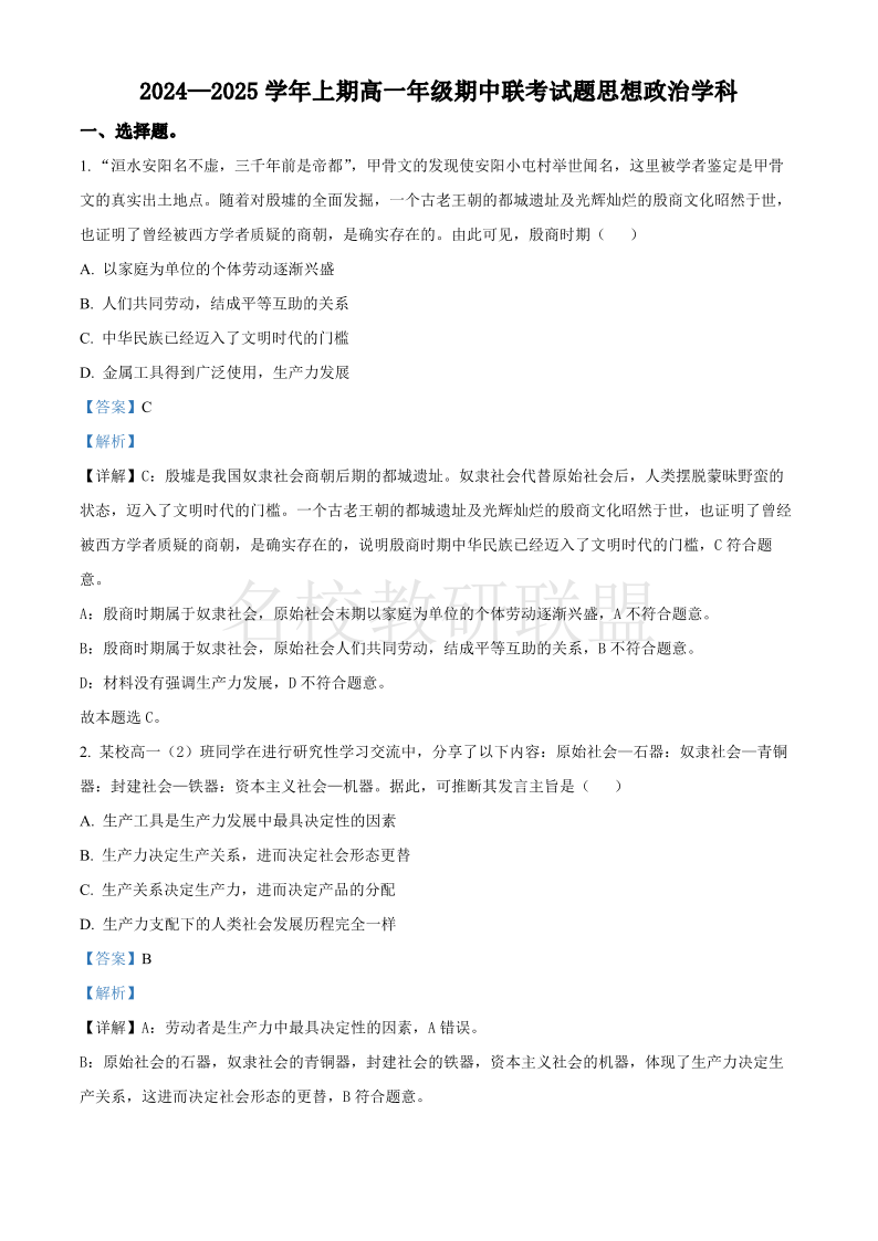 河南省郑州市十校2024-2025学年高一上学期期中联考 政治答案