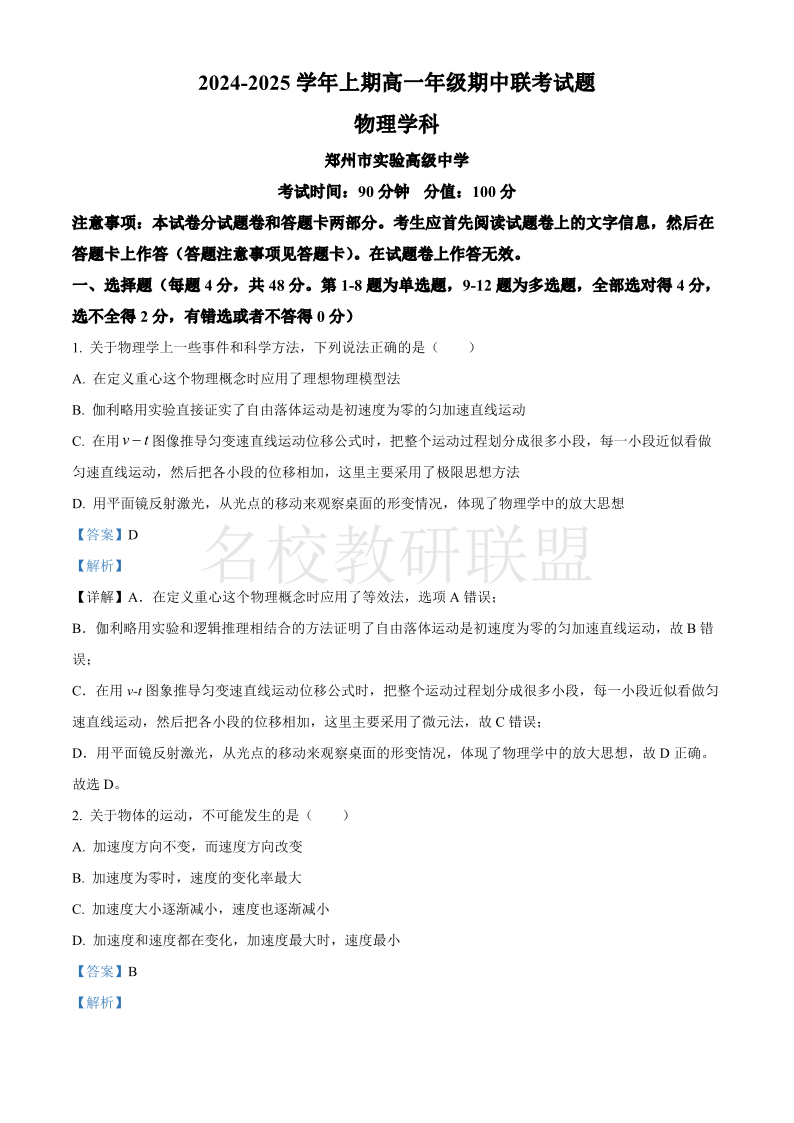 河南省郑州市十校2024-2025学年高一上学期期中联考 物理答案