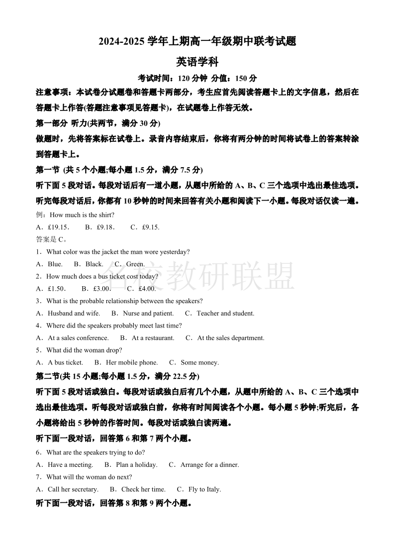 河南省郑州市十校2024-2025学年高一上学期期中联考 英语答案