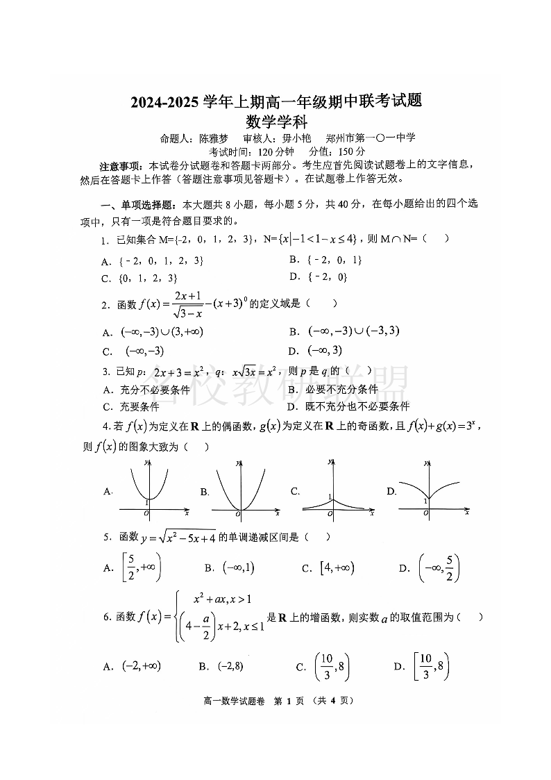 河南省郑州市十校2024-2025学年高一上学期期中联考 数学