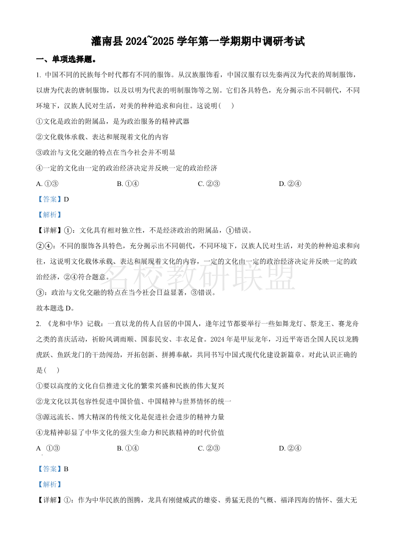 江苏省连云港市灌南县2024-2025学年高二第一学期期中调研考试 政治答案