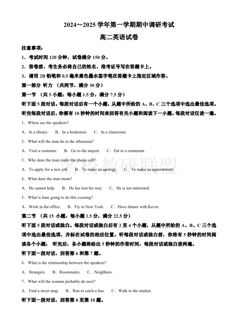 江苏省连云港市灌南县2024-2025学年高二第一学期期中调研考试 英语答案