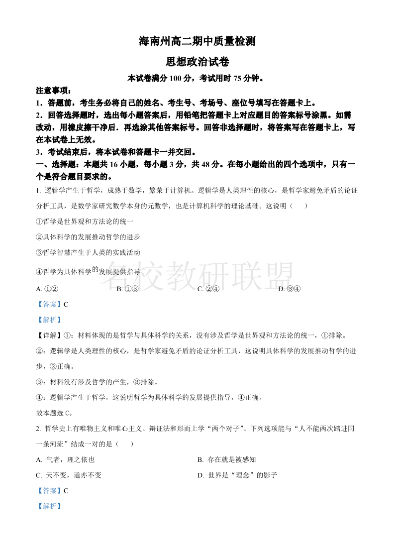 青海省海南州2024-2025学年高二上学期期中质量检测 政治答案