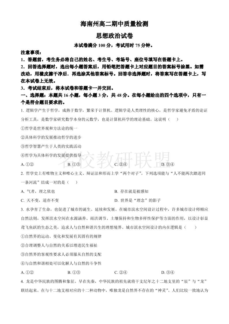 青海省海南州2024-2025学年高二上学期期中质量检测 政治