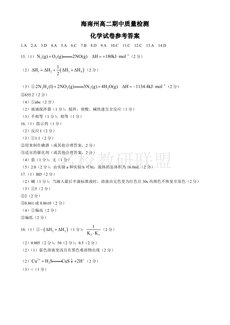 青海省海南州2024-2025学年高二上学期期中质量检测 化学答案