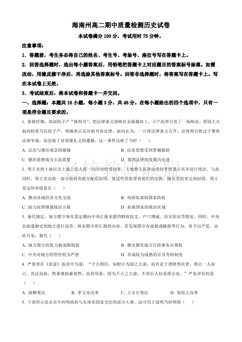 青海省海南州2024-2025学年高二上学期期中质量检测 历史