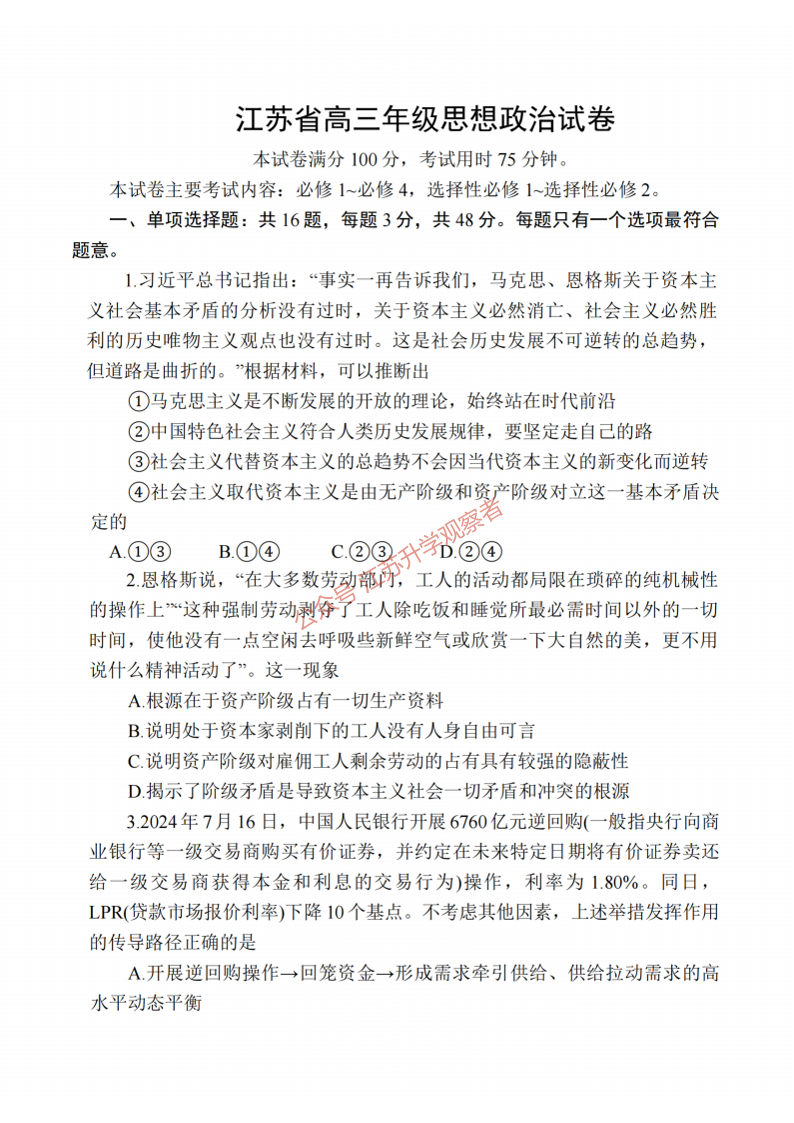江苏省卓越高中联盟2025届高三年级12月月考 政治