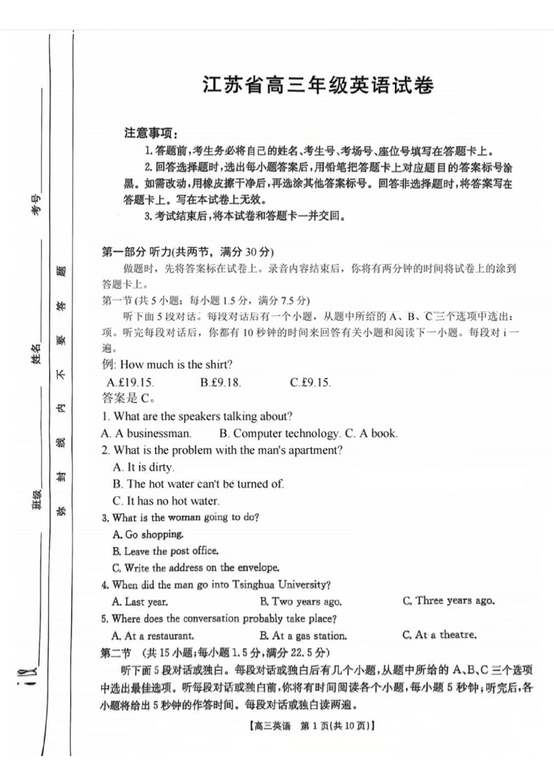江苏省卓越高中联盟2025届高三年级12月月考 英语