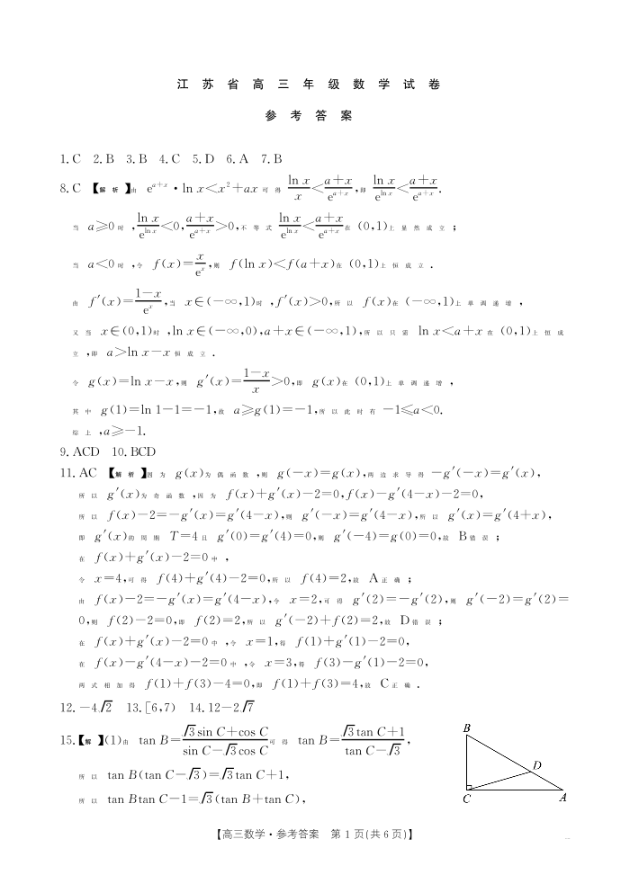 江苏省卓越高中联盟2025届高三年级12月月考 数学答案