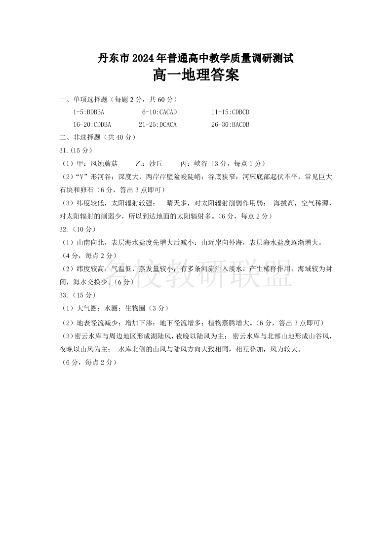 辽宁省丹东市2024-2025学年高一上学期教学质量调研测试 地理答案