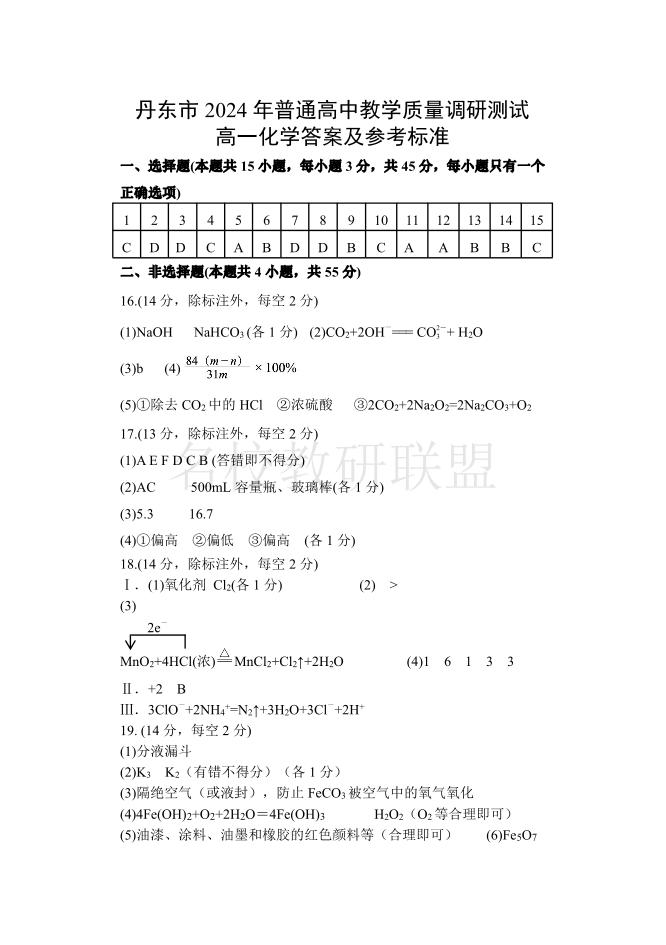辽宁省丹东市2024-2025学年高一上学期教学质量调研测试 化学答案