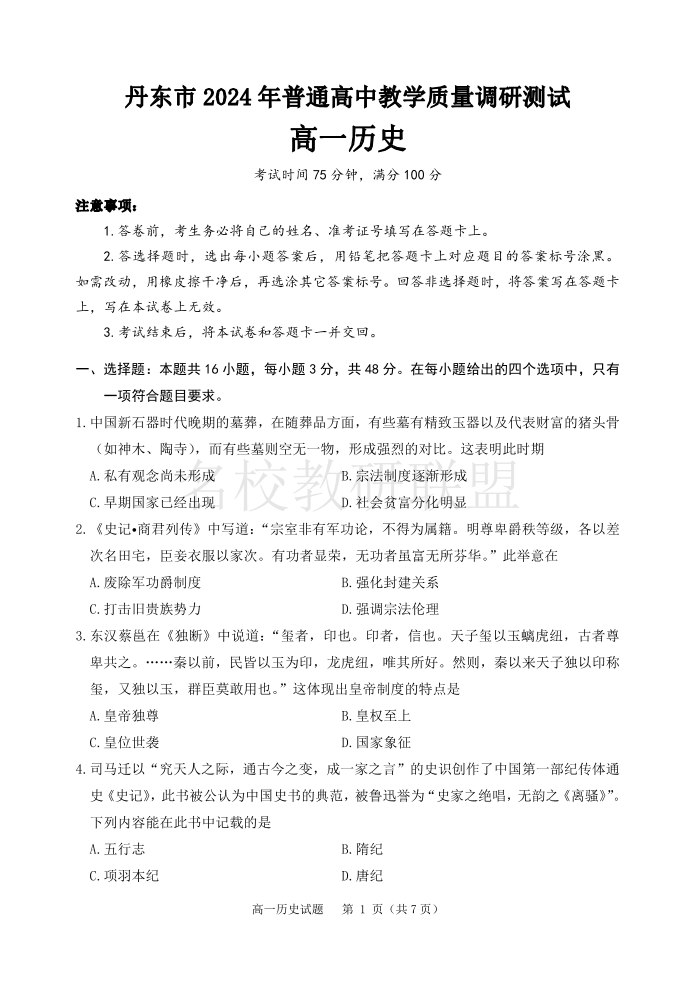 辽宁省丹东市2024-2025学年高一上学期教学质量调研测试 历史