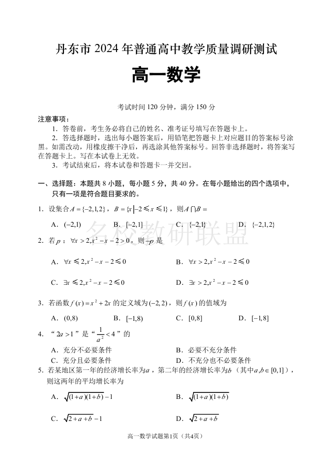 辽宁省丹东市2024-2025学年高一上学期教学质量调研测试 数学