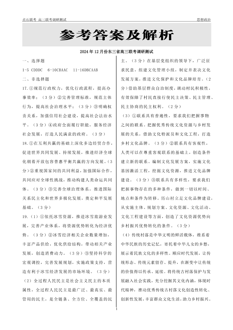 2024年12月份东三省高三联考调研测试 政治答案